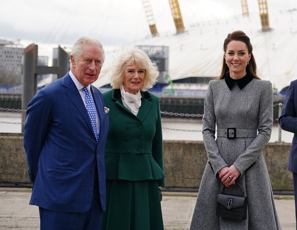 Het gebeurt niet vaak dat Charles en Camilla samen met hun schoondochter op pad gaan. Voor de gelegenheid – er zijn veel textielontwerpers gevestigd in Trinity Buoy Wharf – droeg de vrouw van prins William een jurk van ontwerper Catherine Walker die ze in 2019 ook al eens aan had.