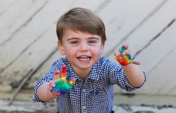 Op de foto’s is Louis met brede grijns op zijn gezicht en met verf op zijn handen bezig met een van zijn eerste artistieke creaties. Het levert een regenboogkleurige afdruk op papier op. Veel kinderen in de Groot-Brittannië kleuren of verven regenbogen als steun voor de NHS, de Britse gezondheidsdienst.