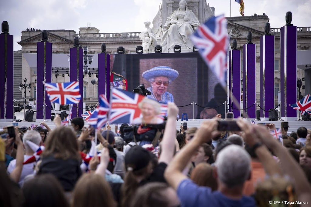 Koningin Elizabeth heeft donderdagavond bij Buckingham Palace zogeheten bakens aangestoken. Met de verlichte bakens wordt haar platina jubileum gevierd. De vorstin liep met een stok en drukte op een grote knop waarna het belangrijkste baken met The Tree of Trees verlicht werd.
