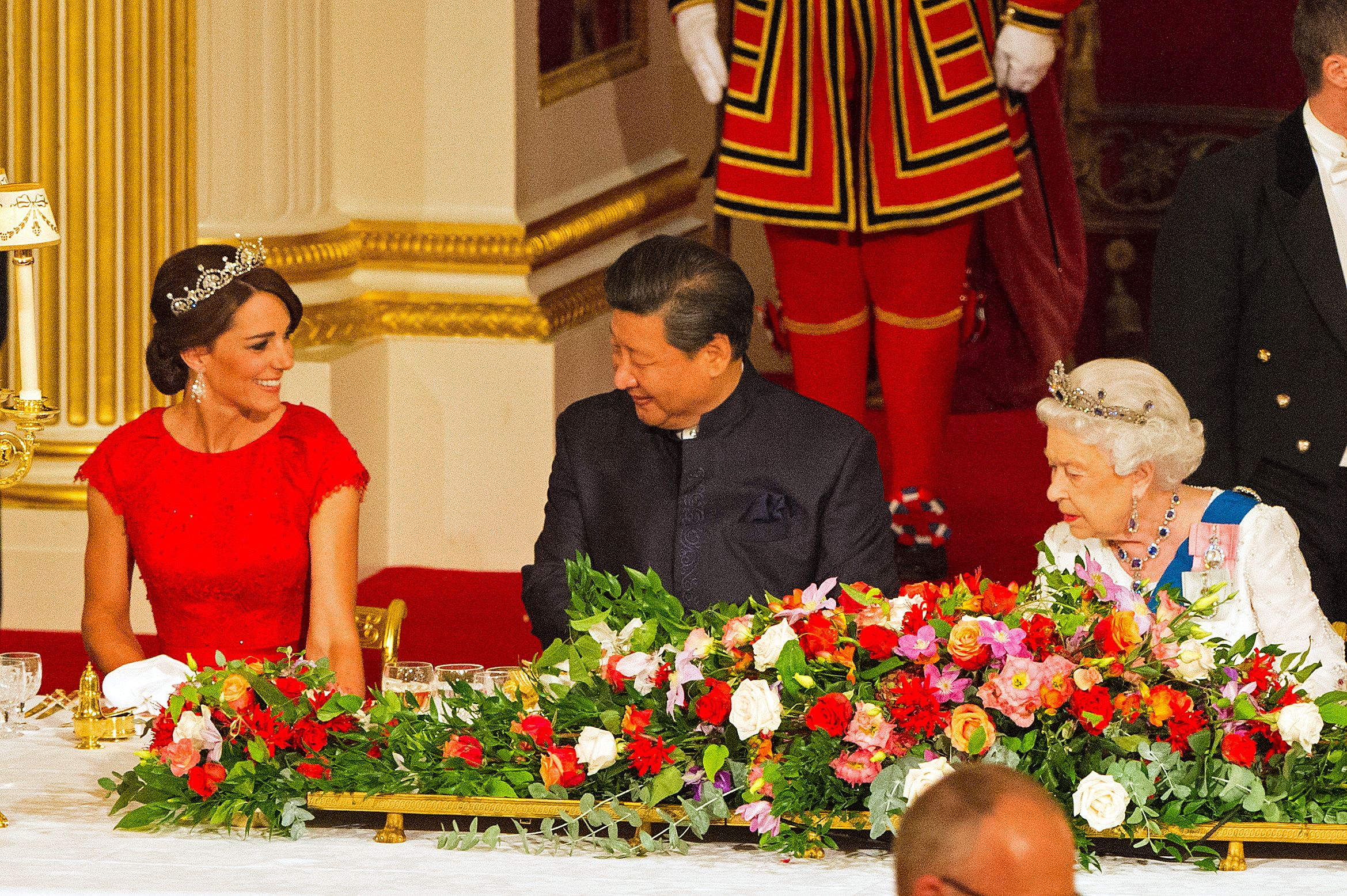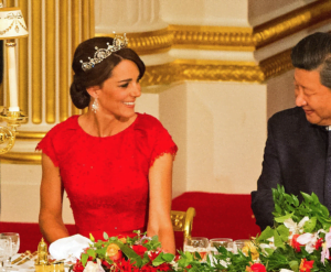 De koningin organiseerde het banket ter ere van het bezoek van de Chinese president Xi Jinping en zijn vrouw aan Engeland. Onder de gasten is dinsdagavond ook hertogin Catherine. Ze draagt een rode jurk, de schitterende tiara en diamenten oorbellen.