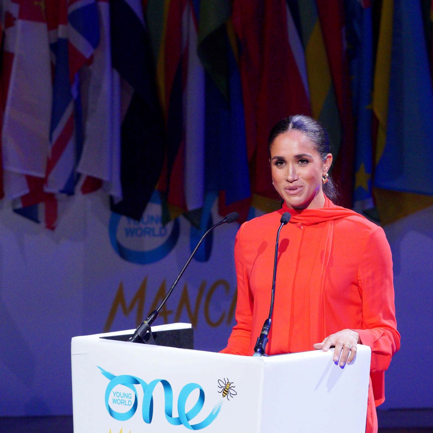 Meghan heeft haar eerste speech in het Verenigd Koninkrijk gegeven sinds haar vertrek naar Californië. De vrouw van prins Harry sprak tijdens One Young World Summit in Manchester, een jaarlijkse bijeenkomst voor jongeren die de wereld willen veranderen, over jonge mensen. “Het is goed om weer in het Verenigd Koninkrijk te zijn”, begon ze haar verhaal.