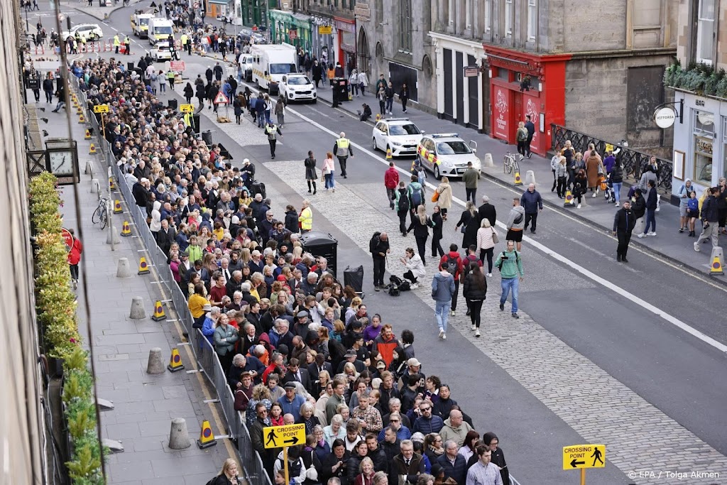 In Edinburgh in Schotland stonden mensen dinsdagochtend al vroeg in de rij om een laatste groet te brengen aan koningin Elizabeth. Volgens Britse media staat de rij tot om de hoek van de St. Giles’ Cathedral waar de kist van de donderdag overleden vorstin staat.