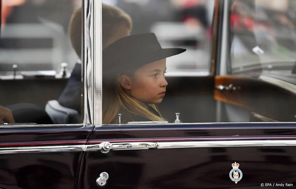 De de kleine prinses Charlotte (7), dochter van troonopvolger prins William en prinses Catherine, kon haar tranen tijdens de uitvaartplechtigheid van koningin Elizabeth niet bedwingen. Haar moeder stond onmiddellijk paraat om de tranen weg te vegen en haar kind te troosten.
