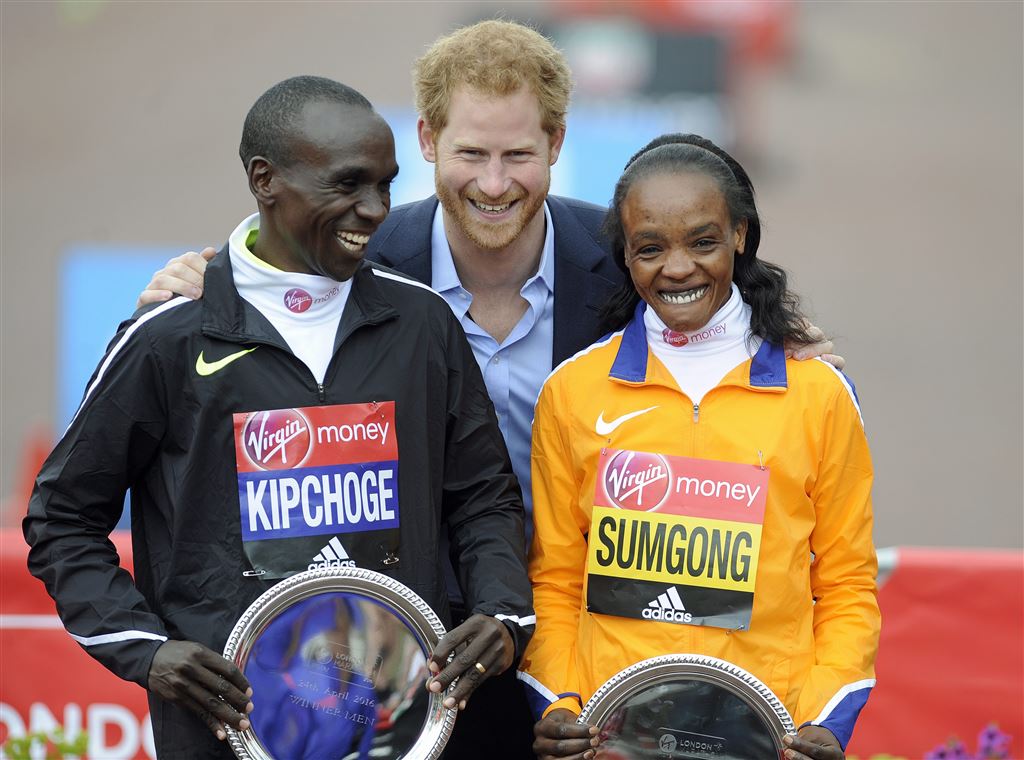 Prins Harry woonde zondag de marathon van Londen bij. Harry feliciteerde Eliud Kipchoge uit Kenia met het behalen van de eerste plaats. Met een tijd van 2.03.05 prolongeerde de Keniaan zijn titel van vorig jaar. Harry reikte ook de prijs uit aan de snelste vrouw, Jemima Sumgong en aan de winnaars van de rolstoelraces. Sumgong zette een tijd van 2.22.58 uur neer.