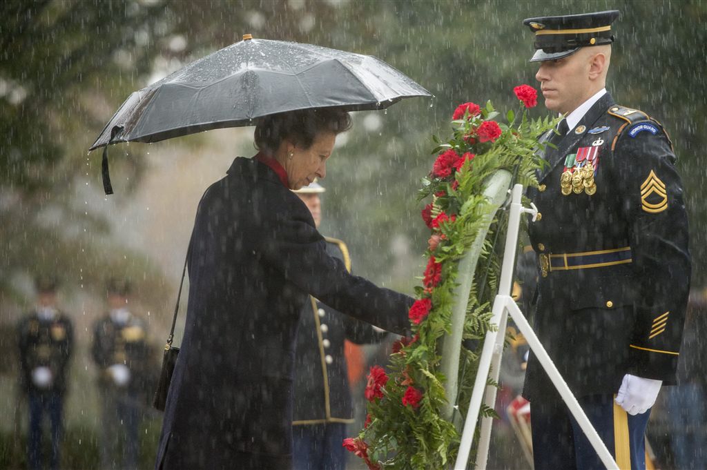 WASHINGTON – De Britse prinses Anne heeft donderdag een krans gelegd bij het graf van de Onbekende Soldaat op het Amerikaanse militaire kerkhof Arlington National Cemetery. Ook onthulde ze een bronzen plaquette voor vijf Amerikanen die meevochten in de Eerste Wereldoorlog, meldt The Washington Post.