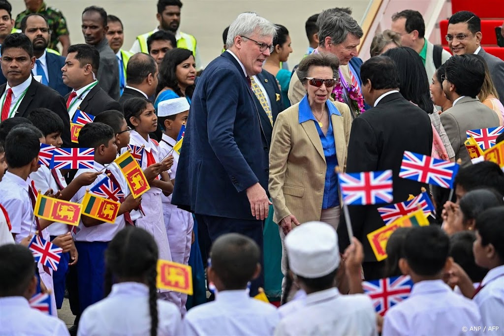 De Britse prinses Anne kreeg woensdag een warm welkom bij aankomst in Sri Lanka. De jongere zus van koning Charles landde in de middag (lokale tijd) op het vliegveld in Colombo, waar een menigte met onder meer Britse vlaggetjes op haar stond te wachten.