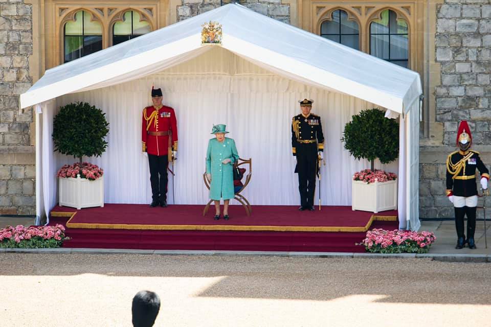 De koningin woonde de plechtigheid zelf bij. Het was voor het eerst sinds ze zich in maart terugtrok op het kasteel dat ze ‘in functie’ even buiten was te zien – al was het voor de Britse bevolking alleen via de camera’s van de BBC. De Guards hadden op de quadrangle alle ruimte om enkele exercities uit te oefenen en zij gaven de Queen een hartverwarmend driewerf ‘hoera!’