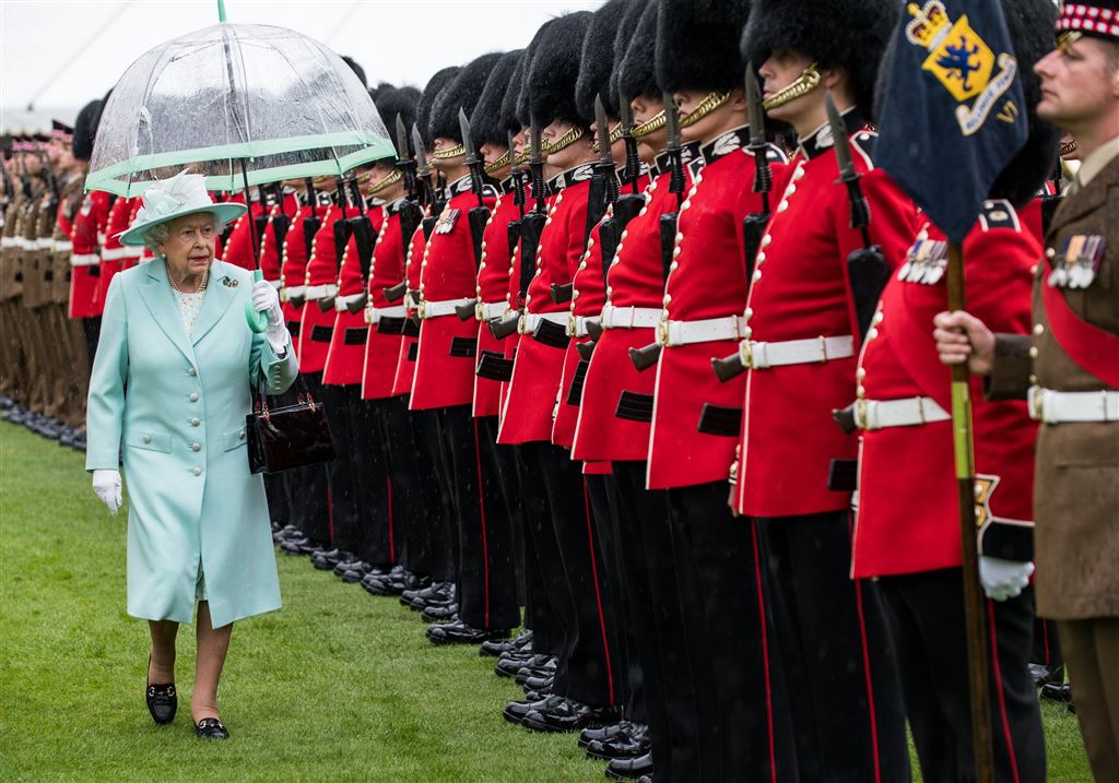 Vanwege de regenbuien inspecteerde Elizabeth, erekolonel van de militairen, de troepen vanonder een paraplu. Die paste wel perfect bij haar lange mintgroene jas. Ruim 2200 gasten woonden de ceremonie bij. Het komt niet vaak voor dat Elizabeth nieuwe regimentsvlaggen uitdeelt. De laatste keer dat ze de Scots Guards nieuwe ‘colours’ gaf was in 2002, het jaar waarin ze haar gouden regeringsjubileum vierde.