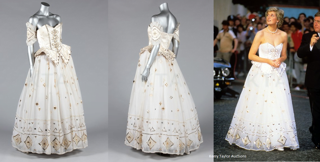 De jurk behoorde tot de geliefdste kledingstukken van de ex-vrouw van de Britse kroonprins Charles. Hij is een ontwerp van David en Elizabeth Emanuel, die ook verantwoordelijk waren voor Diana’s trouwjurk. Diana droeg hem voor het eerst tijdens een benefietmodeshow voor het Rode Kruis in de zomer van 1986.