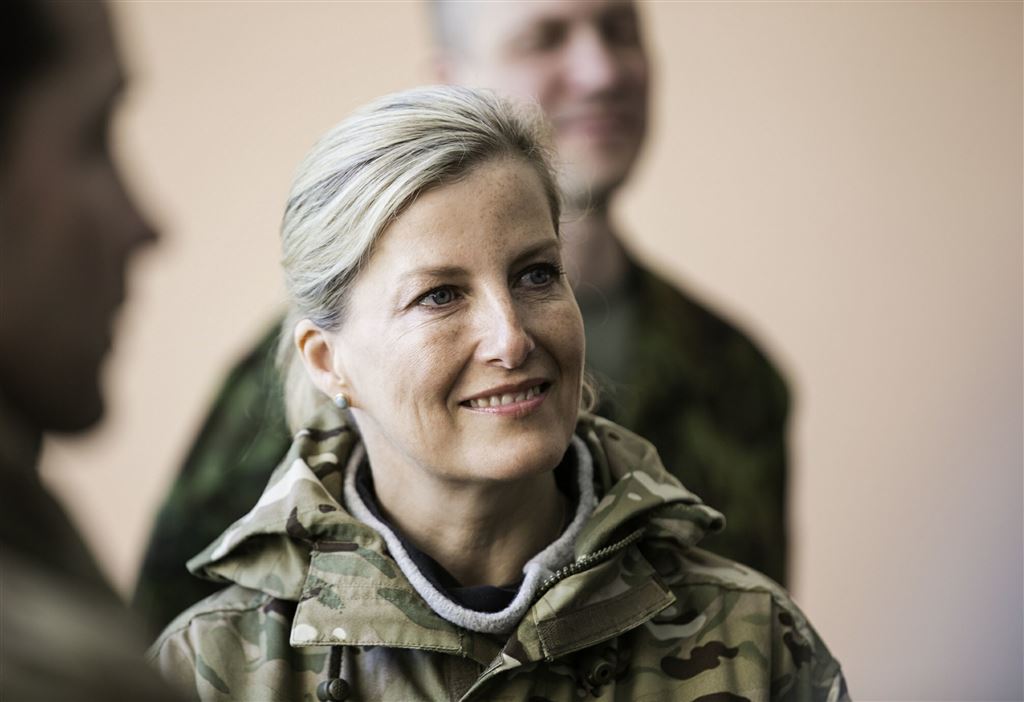 Sophie is erekolonel van het ‘5th Battalion The Rifles’, dat sinds enige tijd in Estland is gehuisvest. De gravin, echtgenote van prins Edward, verscheen in passende outfit bij het bezoek aan de basis: camouflagekleding en legerkistjes.