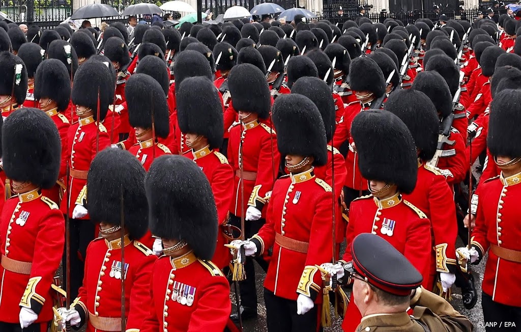 Leden van de King’s Guard dragen de mutsen tijdens ceremoniële militaire evenementen zoals de wisseling van de wacht buiten Buckingham Palace.