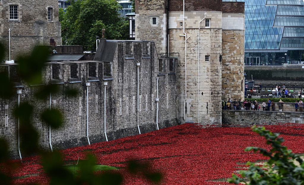Het trio gaat rond het middaguur gezamenlijk naar de Tower of Londen, waar rondom in de gedempte gracht de afgelopen dagen 888.246 klaprozen van keramiek zijn neergelegd om de oorlogsslachtoffers te herdenken. De klaproos is het symbool van de oorlog omdat deze na zware bombardementen zo makkelijk groeide en bloeide in de velden van Vlaanderen.