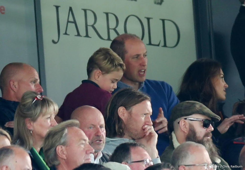 Prinses Kate had haar dochter op schoot en legde het spel aan haar uit. Prins William zat naast zijn zoon en bracht zijn voetbalenthousiasme op hem over. George klapte en sloeg in de lucht van geluk toen Aston Villa scoorde.