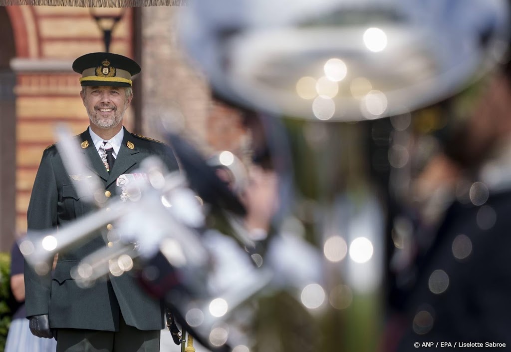 Het Deense hof deelt donderdag beelden van de parade. Daarop is Frederik te zien in militair uniform, net als Voldbjerg met zijn onderscheiding.