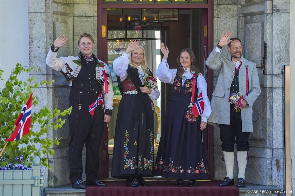 De Noorse royals verschenen in traditionele klederdracht op hun landgoed in Asker, vlak bij de Noorse hoofdstad Oslo. Het Noorse hof deelt op sociale media beelden van Haakon, Mette-Marit, Ingrid Alexandra en Sverre Magnus die naar de kinderen zwaaien.