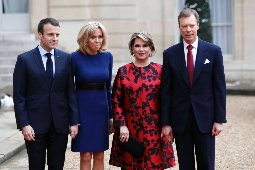 PARIJS – Groothertog Henri van Luxemburg en zijn vrouw groothertogin Maria Teresa zijn maandagochtend in Frankrijk welkom geheten door Emmanuel Macron. De Franse president ontving het Luxemburgse vorstenpaar op het Elysée-paleis in Parijs. Ook zijn echtgenote Brigitte was daar bij.