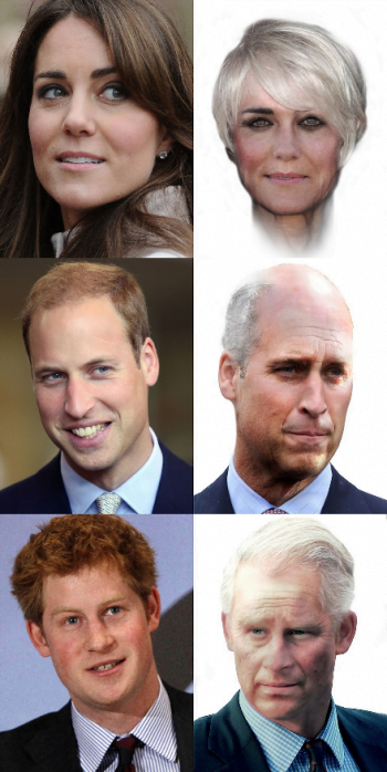 LONDEN – De Britse prins Charles heeft donderdag de respectabele leeftijd van 65 jaar bereikt. Maar hoe zullen de jongere Britse royals eruit zien op die leeftijd? De website Voucher Codes Pro heeft de foto’s van Kate Middleton en de prinsen William en Harry bewerkt om antwoord te geven op die vraag.