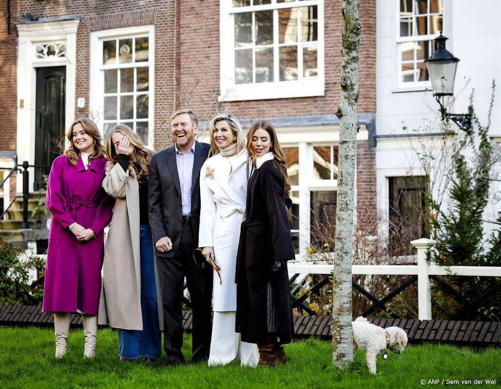 De prinsessen Amalia, Alexia en Ariane gingen vrijdag ook samen op de foto. De in een lange beige jas en jeans gestoken Amalia stond daarbij in het midden. “Nu een andere opstelling”, zei ze na enige tijd. “De mannen?” vroeg de koning grappend, waarna hij Mambo oppakte en knuffelde voor het maken van enkele foto’s.