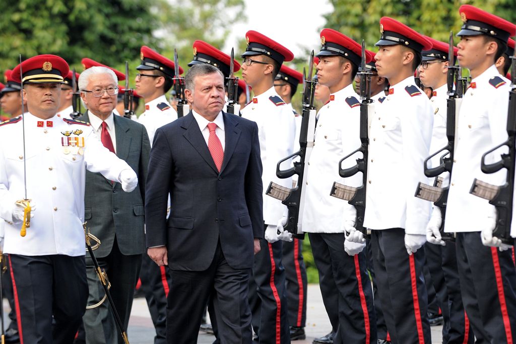De koning van Jordanië inspecteerde de erewacht bij het presidentieel paleis Istana. De koning brengt een officieel bezoek van twee dagen aan het kleinste land van Zuidoost-Azië. Na Signapore reist de Jordaanse koning naar Jakarta.