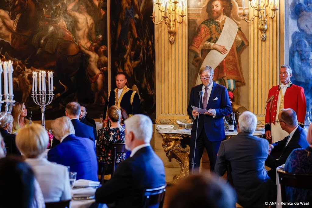 Koning Willem-Alexander is blij dat hij vorige week op Paleis Huis ten Bosch een diner heeft georganiseerd voor alle wereldleiders die in Den Haag waren voor de NAVO-top. Volgens de koning droeg het etentje bij aan een geslaagde top, zei hij maandag tegen de aanwezige pers tijdens de fotosessie in zijn tuin.