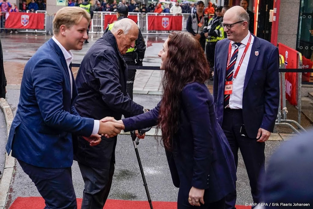 De Noorse koning Harald en zijn kleinzoon prins Sverre Magnus zijn vrijdag bij de WK-kwalificatiewedstrijd tussen Noorwegen en Italië. Voorafgaand aan de wedstrijd werden zij begroet door de voorzitter van de Noorse voetbalbond Lise Klaveness. Noorwegen gaat aan de leiding in de poule met ook Israël en Estland.