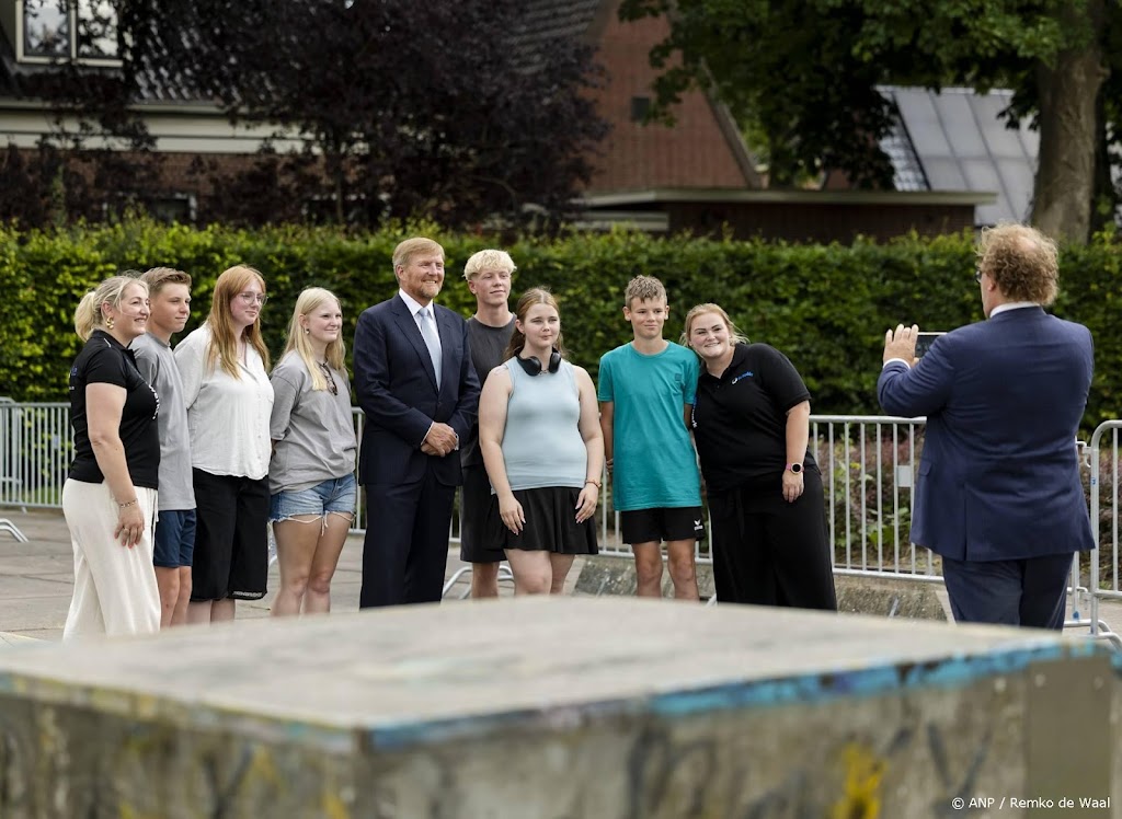 Koning Willem-Alexander heeft tijdens zijn bezoek aan Oude Pekela woensdag aandachtig geluisterd naar jongeren die vertelden over het leven in het Groningse dorp. Op een skatebaan naast de Wedderklap-brug ging hij in gesprek over hun toekomst en poseerde hij met de lokale jeugd.