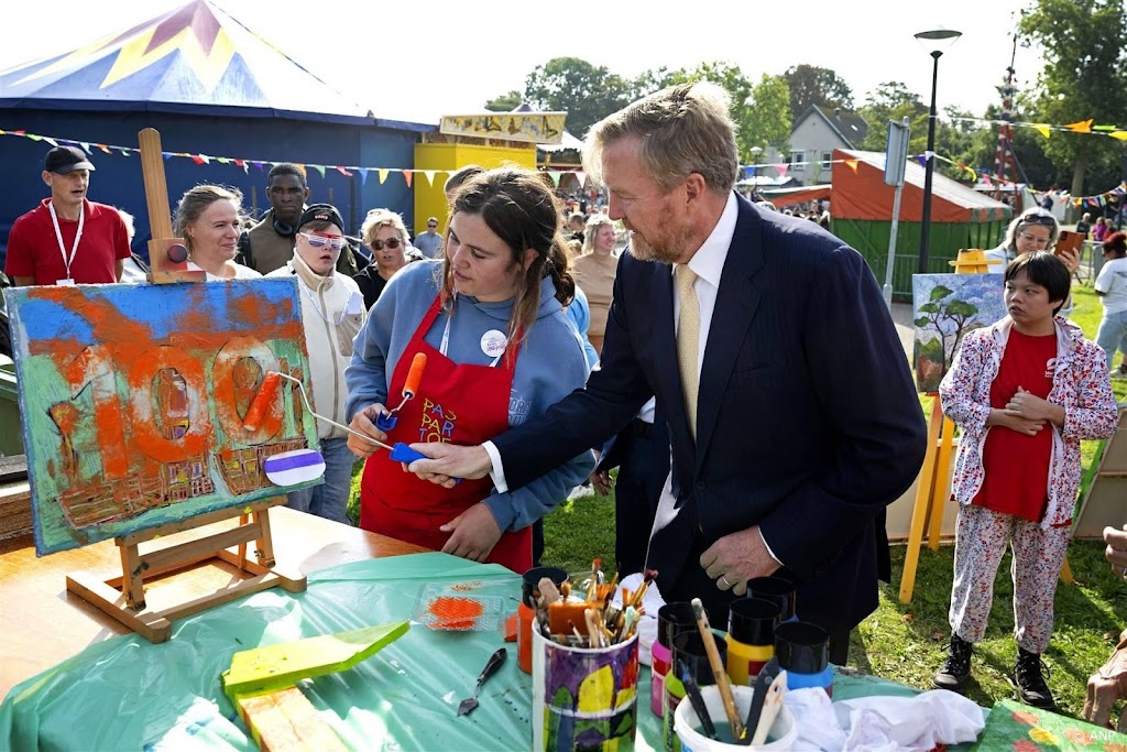 Willem-Alexander sloeg tijdens het bezoek ook even aan het schilderen toen hij een verfroller in handen kreeg. De koning opende woensdag samen met twee cliënten ook de tentoonstelling 100 jaar Willem van den Bergh. De expositie brengt in beeld wat het woonzorgpark al een eeuw biedt als expertisecentrum voor haar cliënten en toont foto’s op het gebied van wonen, dagbesteding en vrije tijd.