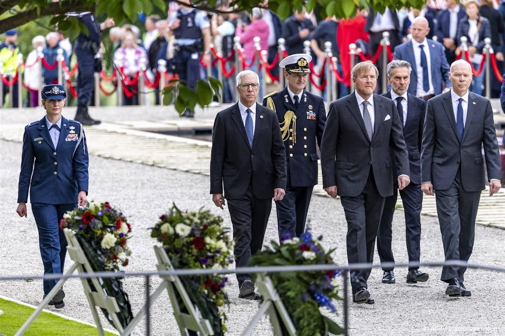 Koning Willem-Alexander heeft zondag de eerste krans gelegd bij de jaarlijkse herdenking op de Amerikaanse militaire begraafplaats in Margraten. Bij de herdenking waren ook premier Dick Schoof, minister Ruben Brekelmans van Defensie en Commandant der Strijdkrachten Onno Eichelsheim aanwezig.