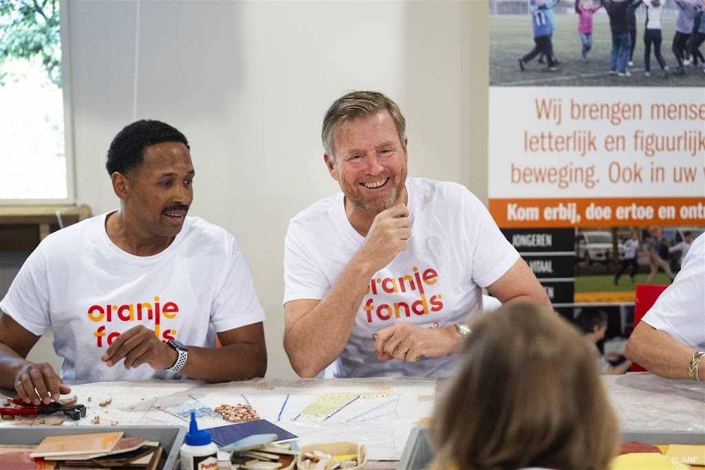 Het koningspaar hielp bij buurthuis Stappers, waar een muur wordt opgevrolijkt met mozaïekwerkjes. De koning en koningin behoren tot de duizenden mensen die vrijdag en zaterdag kennismaken met vrijwilligerswerk dankzij het jaarlijkse initiatief van het Oranje Fonds.