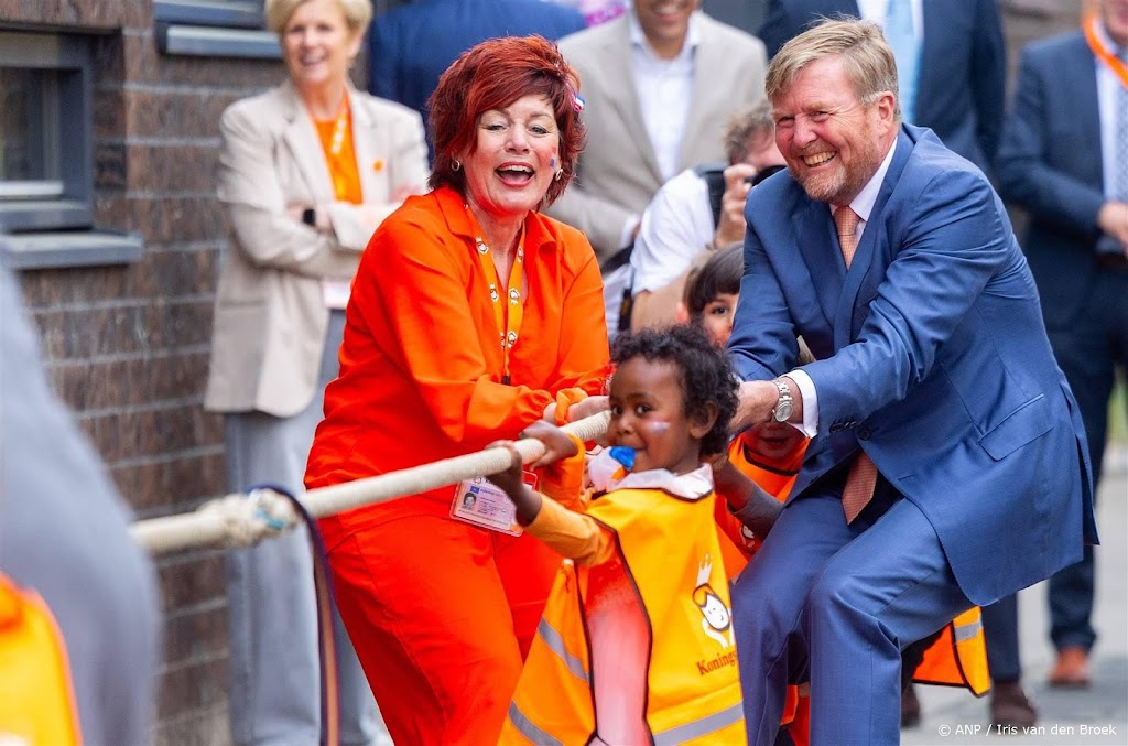 Ook pakte het koningspaar allebei een badmintonracket. Daarmee sloegen zij, net als een groep kinderen, zachtjes tegen oranje ballonnen aan om die in de lucht te houden.