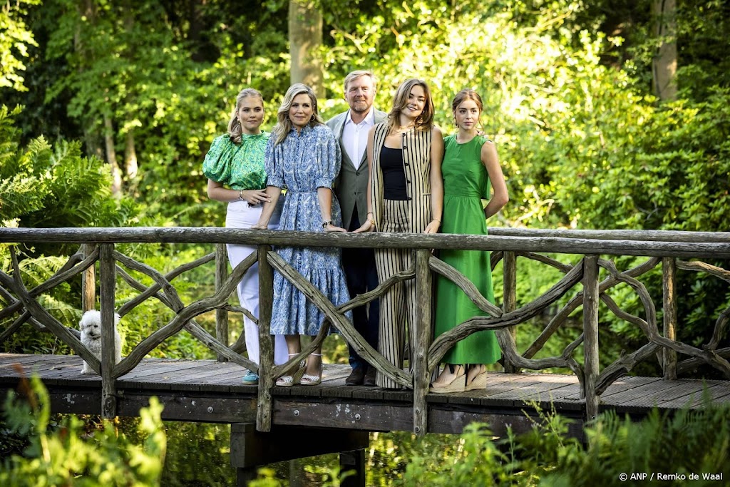 Koning Willem-Alexander, koningin Máxima en hun drie dochters hebben maandag aan het begin van de avond voor de pers geposeerd in de tuin van Paleis Huis ten Bosch. De familie koos voornamelijk voor schaduwrijke plekken onder de bomen. Ook het kleine witte hondje Mambo was weer van de partij.