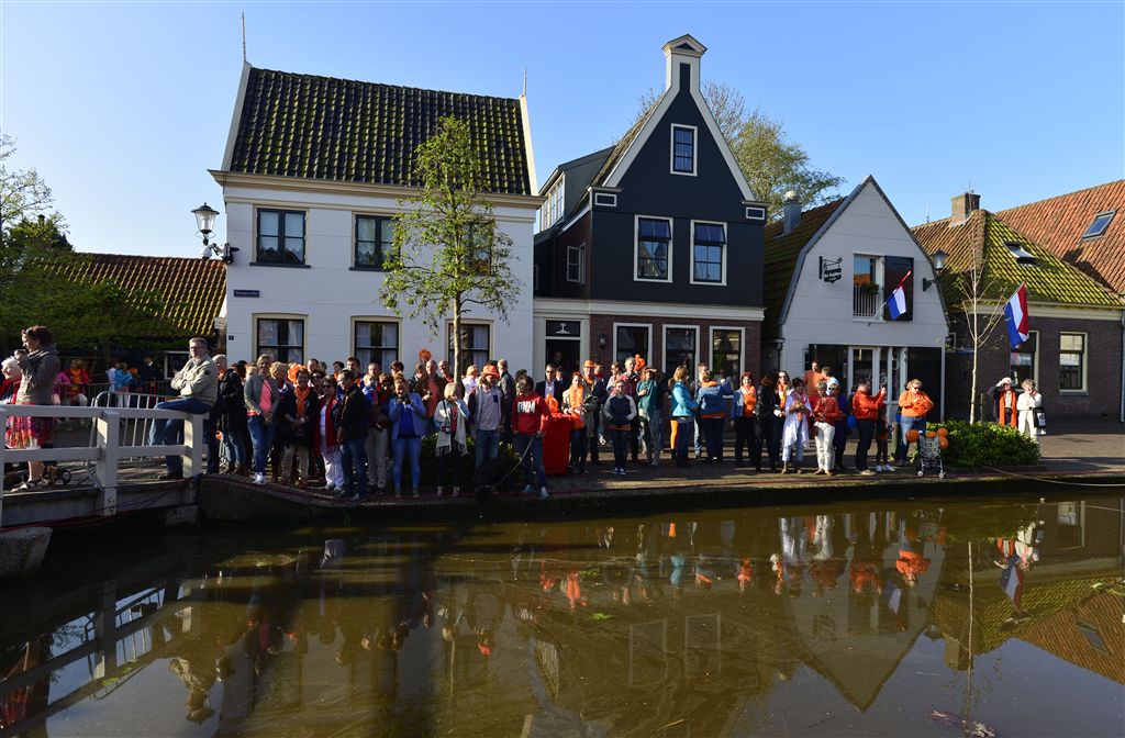 In het zonnetje verzamelen zich steeds meer in Oranje outfits gehulde toeschouwers. Op de plek waar straks de koning en koningin met hun gevolg uitstappen, ligt een blauwe loper.