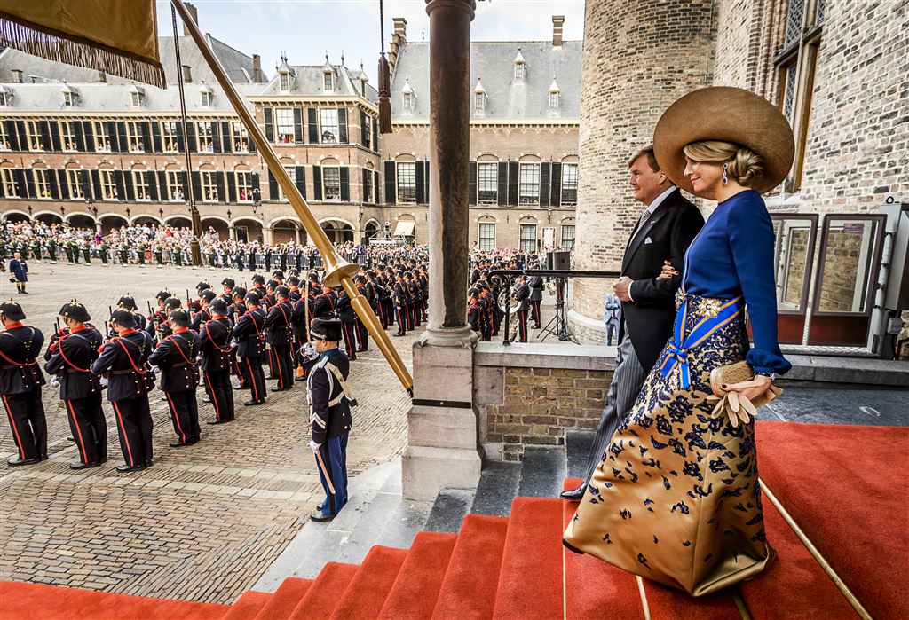 De combinatie bestaat uit een nachtblauwe top van zijde en een goudkleurige zijde satijn rok. Máxima, die vorig jaar geen hoed droeg op Prinsjesdag, koos voor een bijpassende goudkleurige hoed. Iversen ontwierp in 2013 de trouwjurk voor het huwelijk van prins Jaime en prinses Viktória. Máxima droeg vorig jaar zijn ontwerpen tijdens het staatsbezoek aan Denemarken.