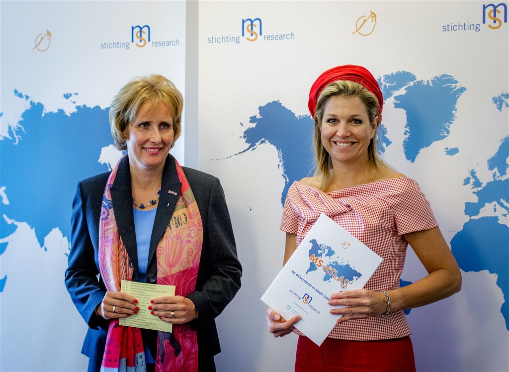 VOORSCHOTEN – Koningin Máxima heeft in Voorschoten de eerste Nederlandse uitgave van de Internationale MS Atlas in ontvangst genomen. Ze kreeg de atlas uit handen van directeur Dorinda Roos van Stichting MS Research.