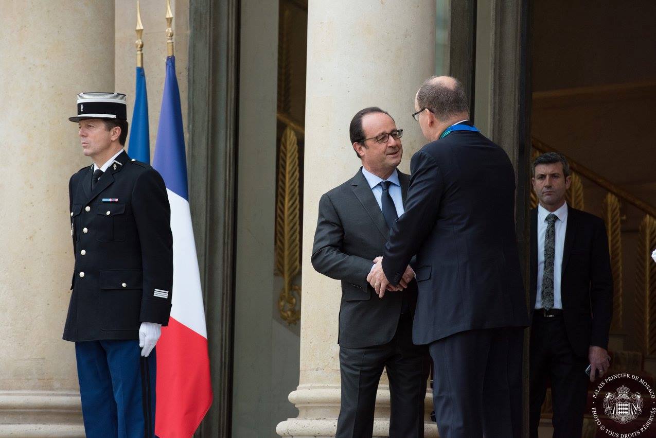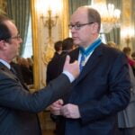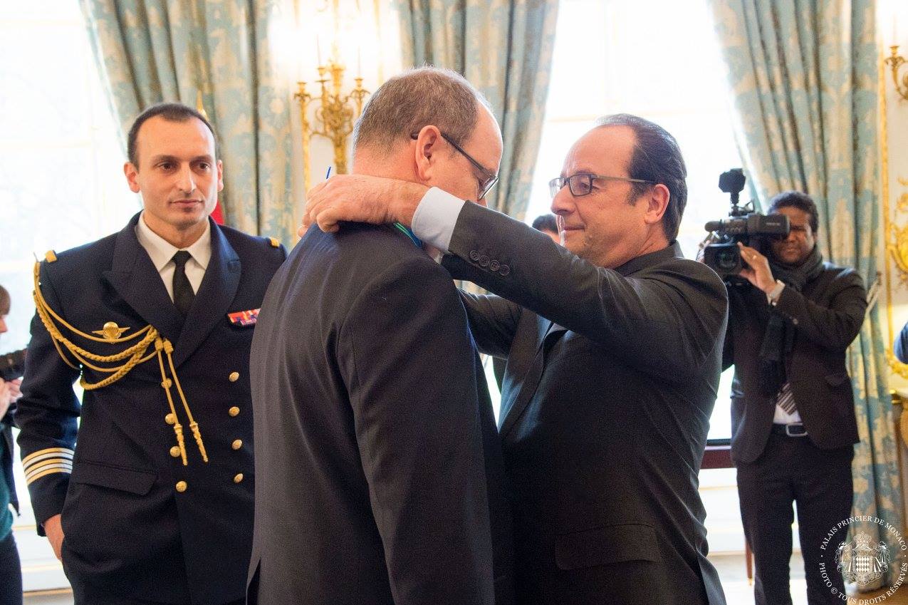 PARIJS – De Franse president François Hollande heeft dinsdag in het Elysée paleis in Parijs een onderscheiding overhandigd aan prins Albert II van Monaco. Die kreeg de versierselen omgehangen behorend bij zijn benoeming tot commandeur van maritieme verdienste.