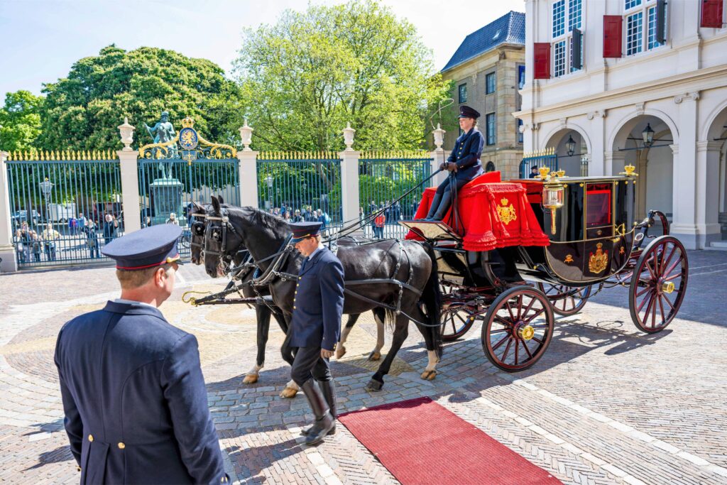 ‘We doen hem nog een keertje’, klinkt het geregeld op het voorplein van Paleis Noordeinde. Met regelmaat wordt er met rijtuig en paarden geoefend op het voorrijden op Prinsjesdag. Het plein is niet helemaal symmetrisch, dus in- en uitrijden vraagt om verschillende bochten. En dat luistert zeer nauw, tot op de centimeter. Oefenen, oefenen dus.