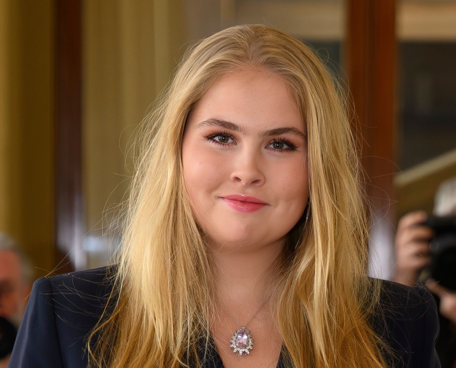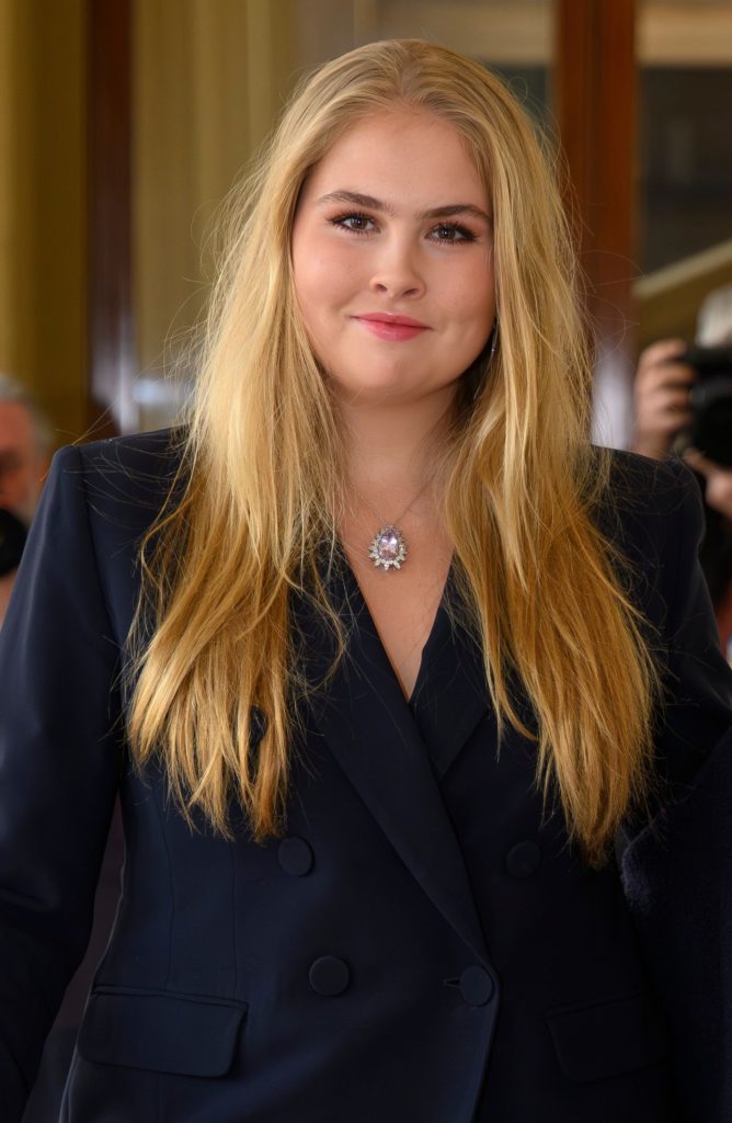 Verder draagt Amalia een hanger “uit Máxima’s juwelenkluis”, schrijft Droogendijk, die op verschillende manieren gedragen kan worden. “Op de dag van Beatrix’ abdicatie droeg Máxima hem op haar taille, aan een rechthoekige broche.”