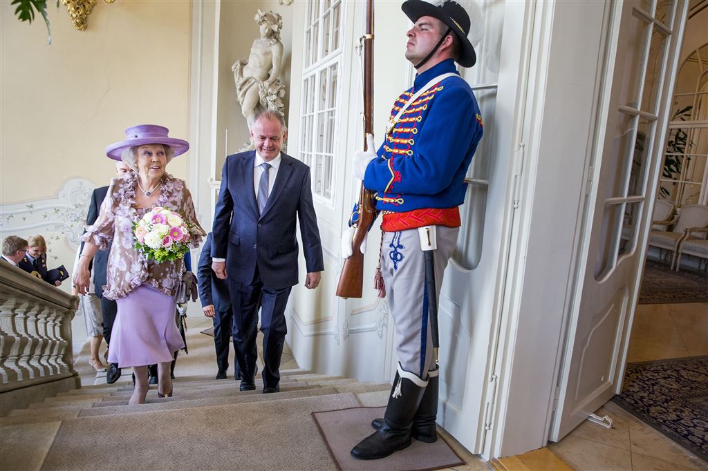 Prinses Beatrix heeft aan het einde van haar bezoek aan het Danubiana Meulensteen Art Museum nog snel even een kijkje genomen op het dak. “Hebben we nog tijd?”, wilde ze weten alvorens de trap te beklimmen om het uitzicht over de Donau en de beeldentuin te bewonderen. Met kennersoog. Ze wist van wie kunstwerken waren, en kon er uitvoerig over uitweiden.