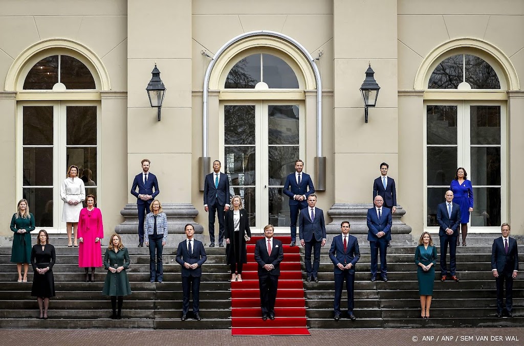 Met de traditionele foto op het bordes achter Paleis Noordeinde is de beëdiging van het nieuwe kabinet door koning Willem-Alexander afgesloten. Premier Mark Rutte en zijn nieuwe bewindslieden hebben het paleis verlaten, en houden later op de dag hun eerste ministerraad.