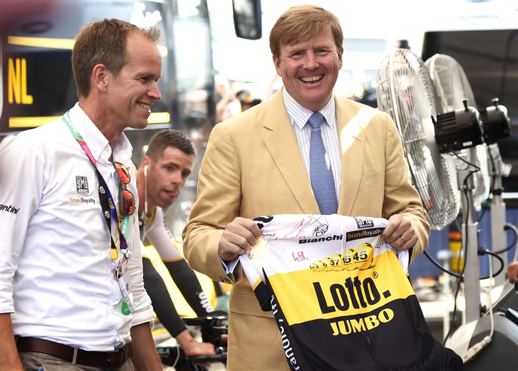 UTRECHT – Koning Willem-Alexander heeft zaterdag bij de finish van de openingsrit van de Tour de France een bezoekje gebracht aan enkele deelnemende teams. De koning werd bij de Jaarbeurs rondgeleid door Jan van Zanen, de burgemeester van Utrecht.
