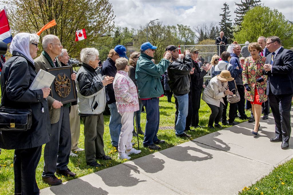 Het publiek wachtte lange tijd in zon en wind op het Nederlandse bezoek, dat in het Liberation Memorial Park een kopie van de gedenkplaat onthulde die in Wageningen op hotel De Wereld is aangebracht. Prinses Margriet werd luid toegejuicht toen ze voor de onthulling het woord richtte tot de duizenden in het parkje.