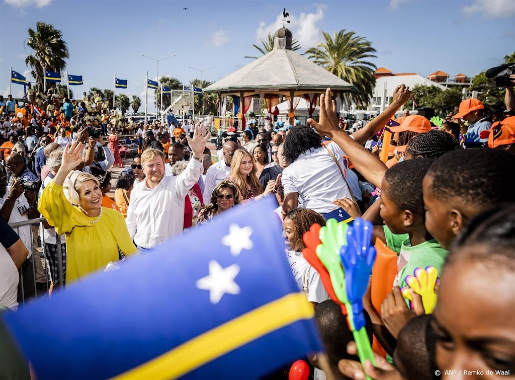 De eerste dag van koning Willem-Alexander, koningin Máxima en prinses Amalia op Curaçao is chaotisch begonnen. De beveiligers van de Oranjes moesten regelmatig in discussie met lokale beveiligers, tussen de delegatie en de pers liepen een hoop toeristen met hun telefoon foto’s te maken en er was onverwachts een harde knal te horen. Toch was de sfeer ook gezellig op het plein: duizenden kinderen en volwassenen waren op het gezelschap afgekomen.