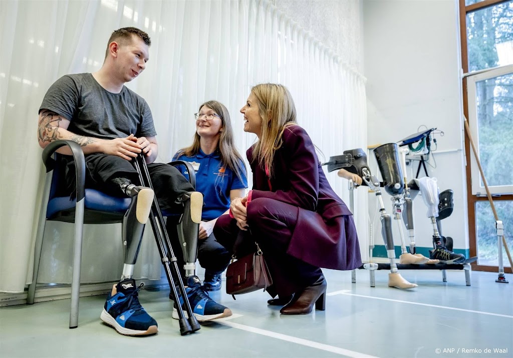 Een rondleiding door het centrum bracht de koningin als eerste naar de oefenruimte voor fysiotherapie. Daar sprak ze via een tolk met twee Oekraïners die beiden in de oorlog hun benen verloren. Een van hen vertelde haar dat hij nu vier maanden in Nederland is. Of hij het moeilijk vindt om door te zetten, wilde de koningin weten. Soms, antwoordde hij, maar het lukt omdat hij een doel heeft. Wat dat doel dan is, vroeg de koningin. “Ik wil weer volledig zelfstandig zijn, zonder krukken kunnen lopen”, vertelde hij via de tolk. Zijn fysiotherapeut vertelde dat de man ook graag sport. Voetbal, tennis en basketbal, beaamde hij. “Fantastisch, een ijzersterke wil”, vond de koningin.