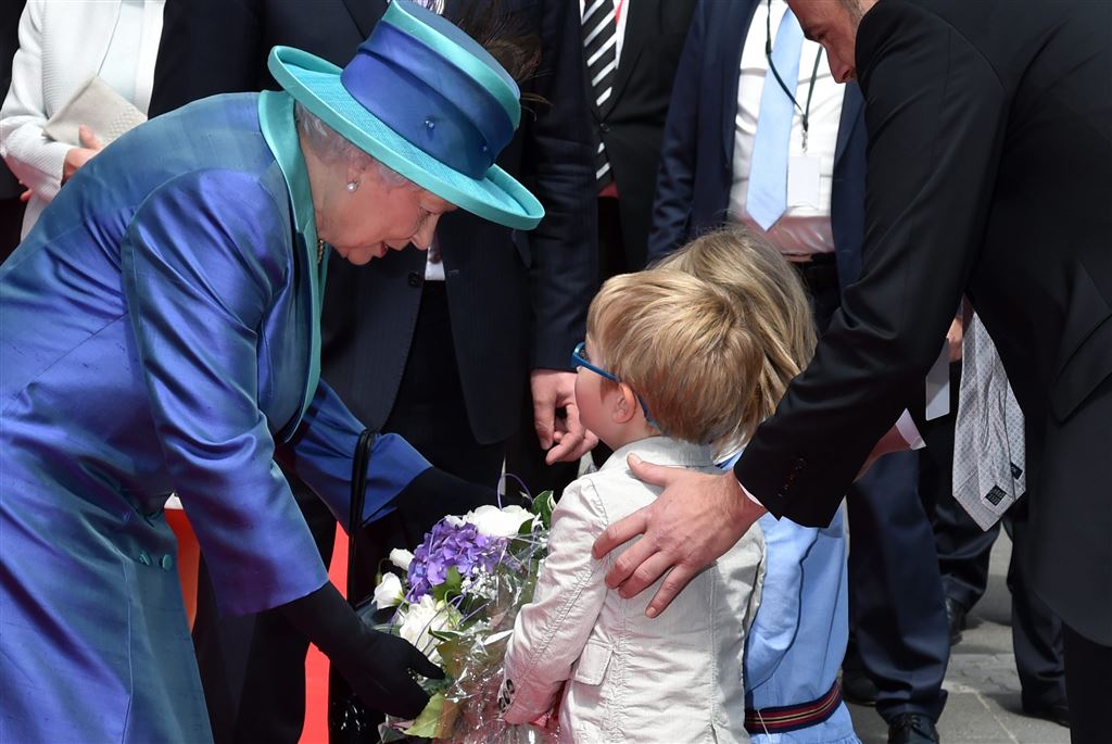 Elizabeth werd welkom geheten door de minister-president van Hessen, Volker Bouffier, en zijn vrouw Ursula. De koningin werd vergezeld door de Duitse president Joachim Gauck. Veel mensen stonden volgens persbureau DPA uren te wachten op de komst van Elizabeth. In de stralende zon werd zij toegezongen door het kinderkoor van de Frankfurter Domsingschule.