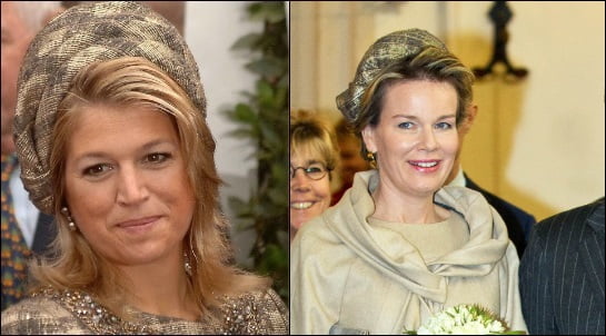 Koningin Máxima en koningin Mathilde worden regelmatig gespot met soortgelijke kleding en accessoires van modehuis NATAN. Beide koninginnen voelen zich thuis bij het Belgische modehuis en zijn in de loop der jaren trouwe klant geworden. Ook Fabienne Delvigne, de modiste die samenwerkt met NATAN, is inmiddels een bekend gezicht bij de beide dames en heeft al menig hoed mogen ontwerpen voor koninklijke aangelegenheden. Vaak zijn de ontwerpen heel verschillend dankzij de vele mogelijkheden qua model en stof, maar soms duiken er ook exemplaren op die sterk op elkaar lijken. Hierboven ziet u hier een voorbeeld van. Het model van de hoeden is verschillend, maar de stof waarmee is gewerkt is gelijk. Welke hoed vindt u mooier?