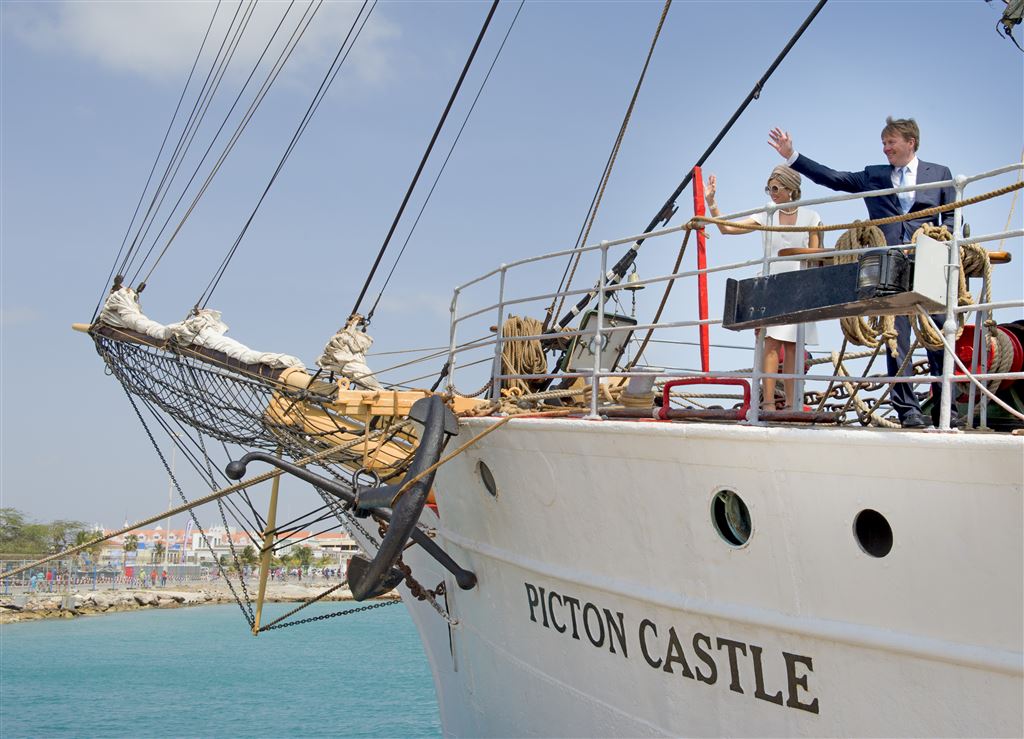 Willem-Alexander en Máxima aanschouwden vrijdag de Sail-in vanaf de kade in de cruisehaven van Oranjestad. Het koningspaar woonde vrijdagmiddag aan boord van het patrouilleschip Zr. Ms. Zeeland demonstraties op zee bij van de Koninklijke marine en de kustwacht.