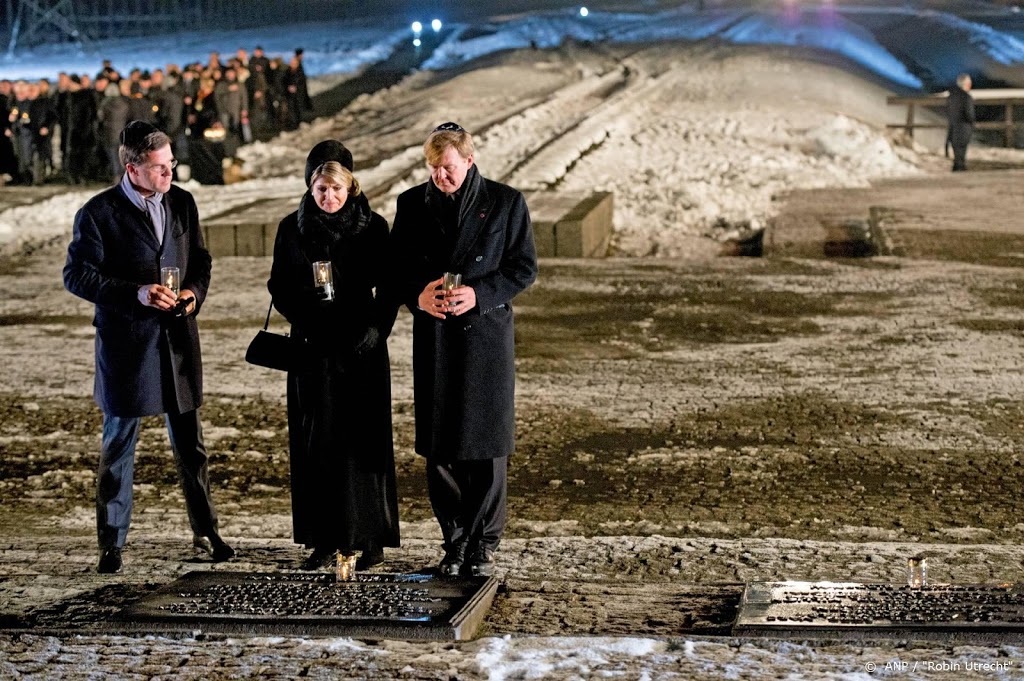 Koning en koningin branden kaarsje bij herdenking Auschwitz