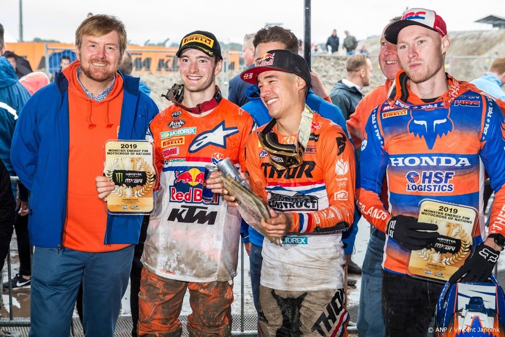 Koning Willem-Alexander zag zondagmiddag op het circuit van Assen hoe Nederland voor het eerst de Motorcross of Nations won. Na afloop feliciteerde hij coureurs Jeffrey Herlings, Glenn Coldenhoff en Calvin Vlaanderen met hun overwinning.