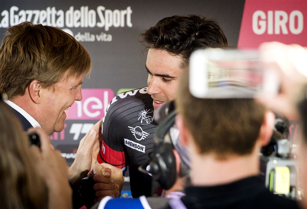 De Nederlander Tom Dumoulin won vrijdag de proloog en pakte daarmee de roze trui. “Een prachtige prestatie”, vond Willem-Alexander, die de Limburgse renner voor aanvang van zijn rit succes had gewenst.