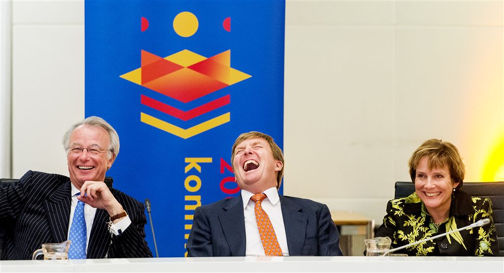 DEN HAAG – Koning Willem-Alexander heeft zaterdagmiddag veel plezier beleefd aan het Grondwet Festival. Hij moest hard lachen om de wijze waarop zijn verre voorvader Willem I – gespeeld door de acteur Hubert Fermin – op geraffineerde wijze zijn grote tegenstrever Gijsbert Karel van Hogendorp (Joop Keesmaat) bestreed.